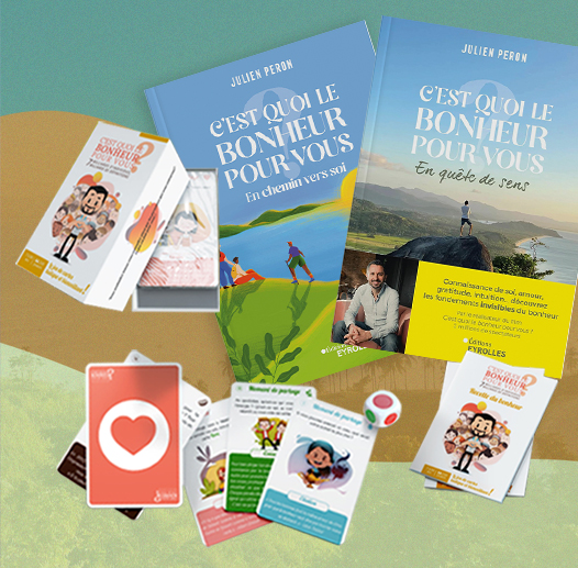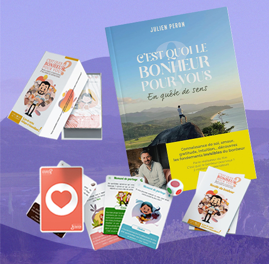 Version numérique des films « C’est quoi le bonheur pour vous? » + Kit pédagogique (28 pages) + « L’école de la vie, une génération pour tout changer » + Livret de 40 pages. + le jeu de cartes C'est quoi le bonheur pour vous?